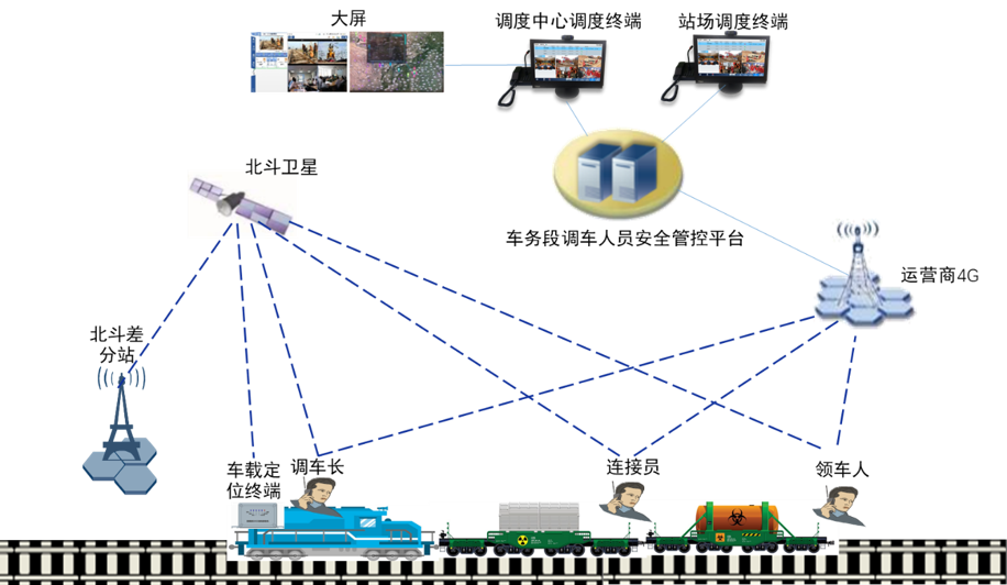 编组站作业人员、调车机车、设备设施顺利获得北斗精准定位及5G回传,系统可实时显示人员位置、轨迹,为智能调车、作业安全给予支持。