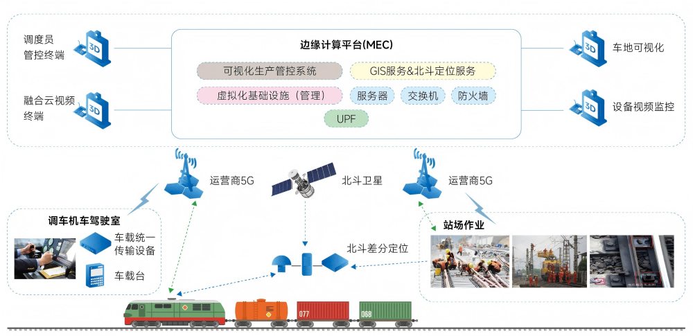 以云计算、云存储为硬件平台,语音、数据、视频综合处理能力的飞鸿融合调度通信平台为业务平台,结合5G切片和北斗高精技术给予高通量的数据传输(高清视频)和精确定位(厘米级)服务,实现调机自动化系统车地信息实时传输、车地可视化调度指挥、调车机车及现场作业人员位置可视化、作业过程管控、轨边设备风险智能识别等功能,提升了调车作业自动化水平,提高调车、货检、列检等作业效率,有力保障调车及作业人员安全。